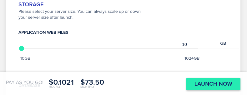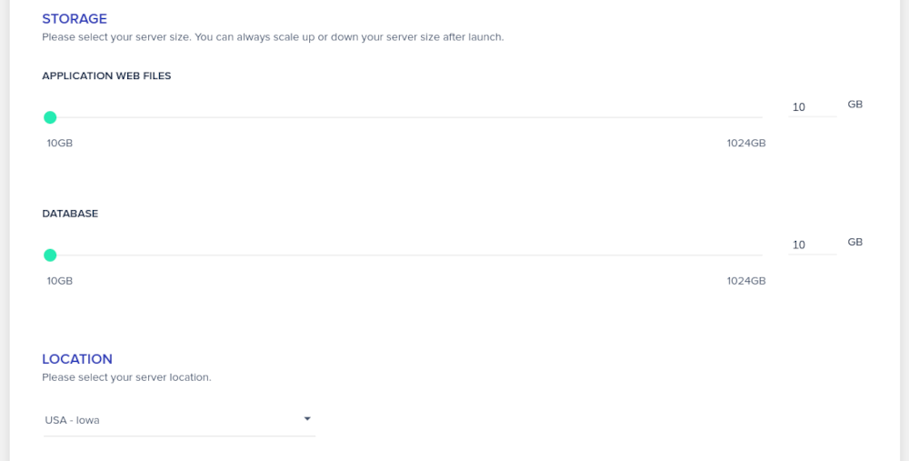 その他のオプションには、サーバーの場所、帯域幅、アプリケーションストレージ、データベースストレージサイズなどがあります。