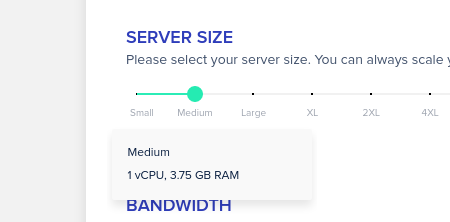 使用可能なオプションの中から、サーバーのサイズを選択する必要があります(使用可能なリソースに応じて)。 たとえば、中規模のサーバーには3.75GBのRAMと1つのCPUが搭載されています。