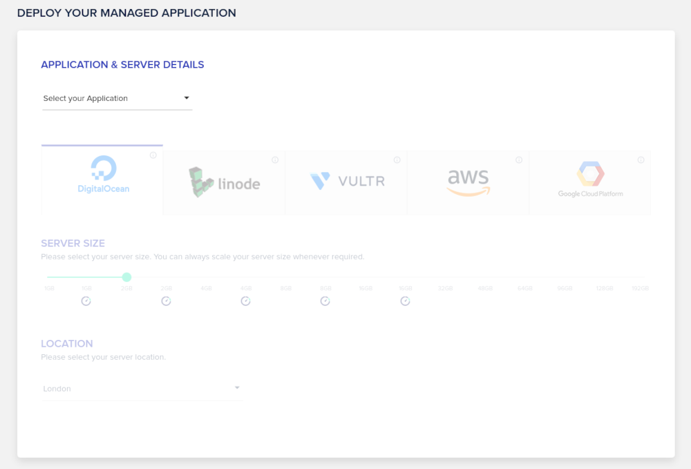 ステップ2 。 次に、サーバーにインストールするアプリケーション(ここではWordPress)を選択し、優先するクラウドホスティングプロバイダーを選択する必要があります。