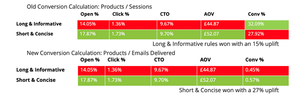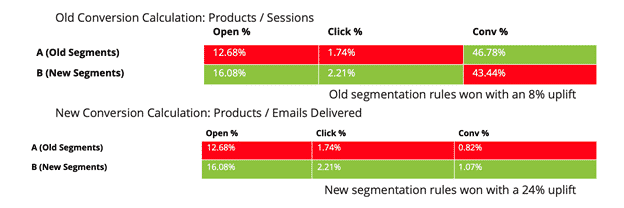 이 두 클라이언트 예에서 볼 수 있듯이 전환은 열기와 클릭이 의미하는 대로 이어졌습니다. 마케터는 더 높은 비율을 산출하기 때문에 허영심을 위해 "페이지 세션/구매" 계산을 사용합니다. 그러나 이는 잘못된 결과에 대해 최적화할 수 있음을 의미합니다.