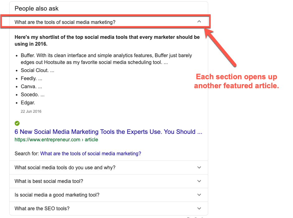 목표 중 하나는 고객이 어떤 질문을 하는지 알아내는 것이어야 합니다. 예를 들어 Google에 "최고의 소셜 미디어 도구는 무엇입니까?"라고 입력했습니다. 추천 스니펫은 Buffer에서 가져왔습니다. 그러나 그 아래에는 관련 질문 목록이 있었습니다.