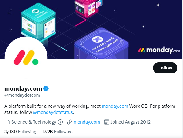 매우 창의적인 예인 Monday.com의 사용자 이름은 ".com" 대신 @mondaydotcom입니다. 여기서 얻을 수 있는 사실은 브랜드의 진정성을 유지하면서 작업을 약간 다르게 선택할 수 있다는 것입니다.