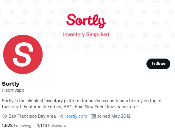 가장 간단한 인벤토리 플랫폼인 Sortly는 회사 이름 뒤에 "앱"을 Twitter 핸들로 추가하기로 결정했습니다. 다시 말하지만, 이것은 원하는 사용자 이름을 사용할 수 없지만 사용자가 수행한 작업은 "앱"인 정확히 무엇인지 지정했다는 것입니다.