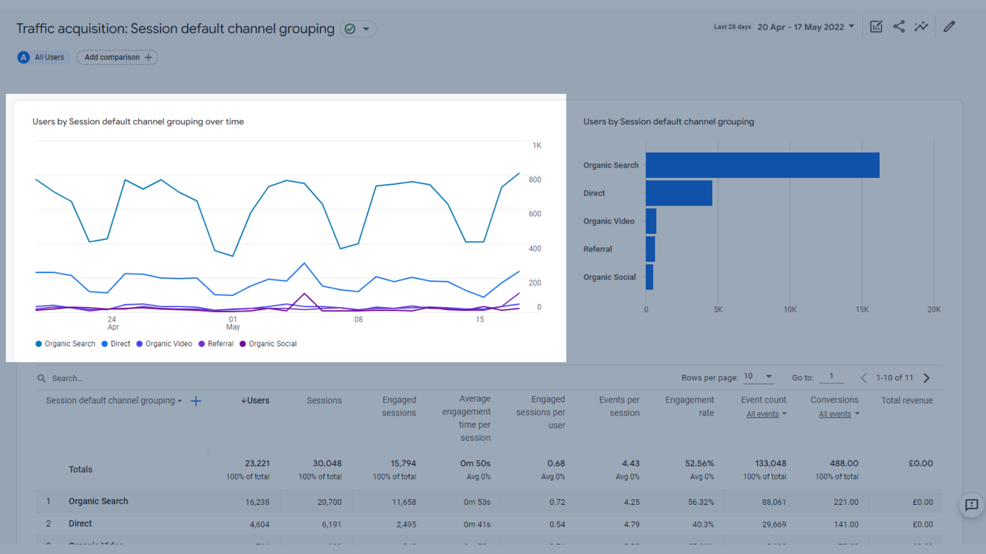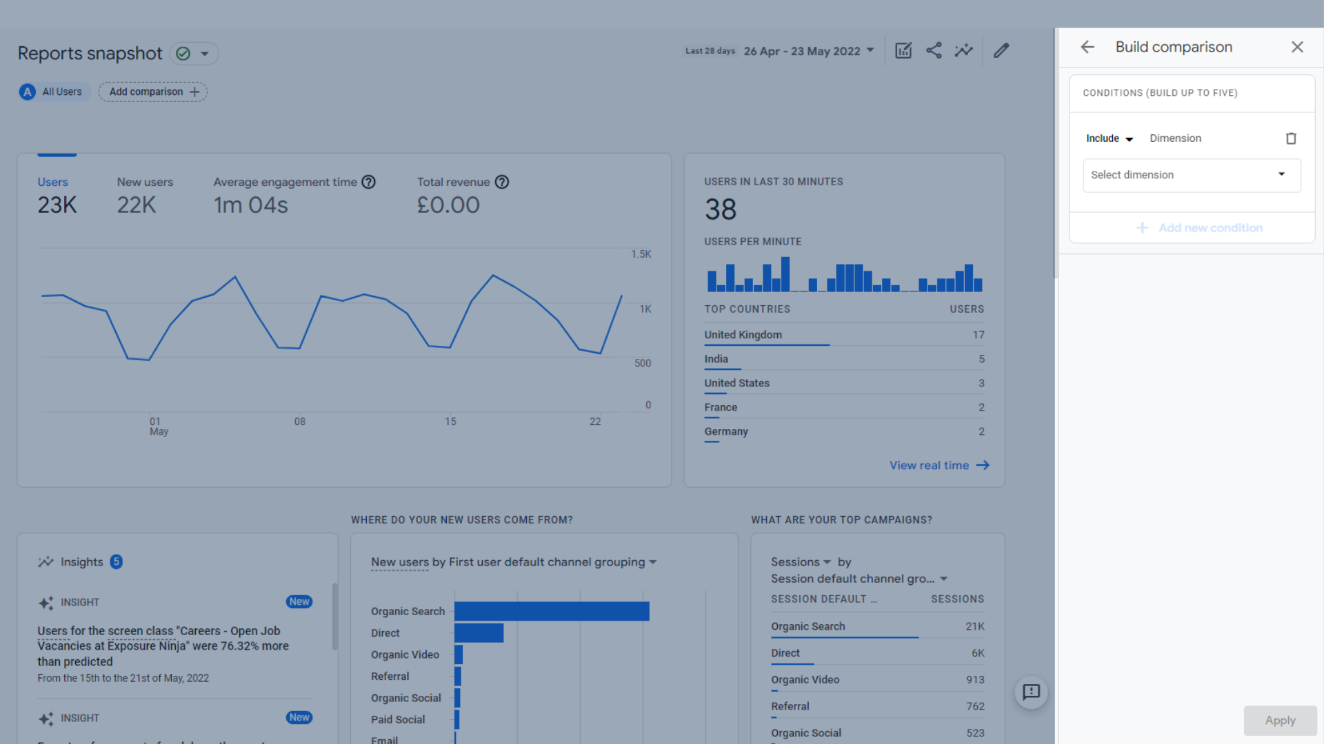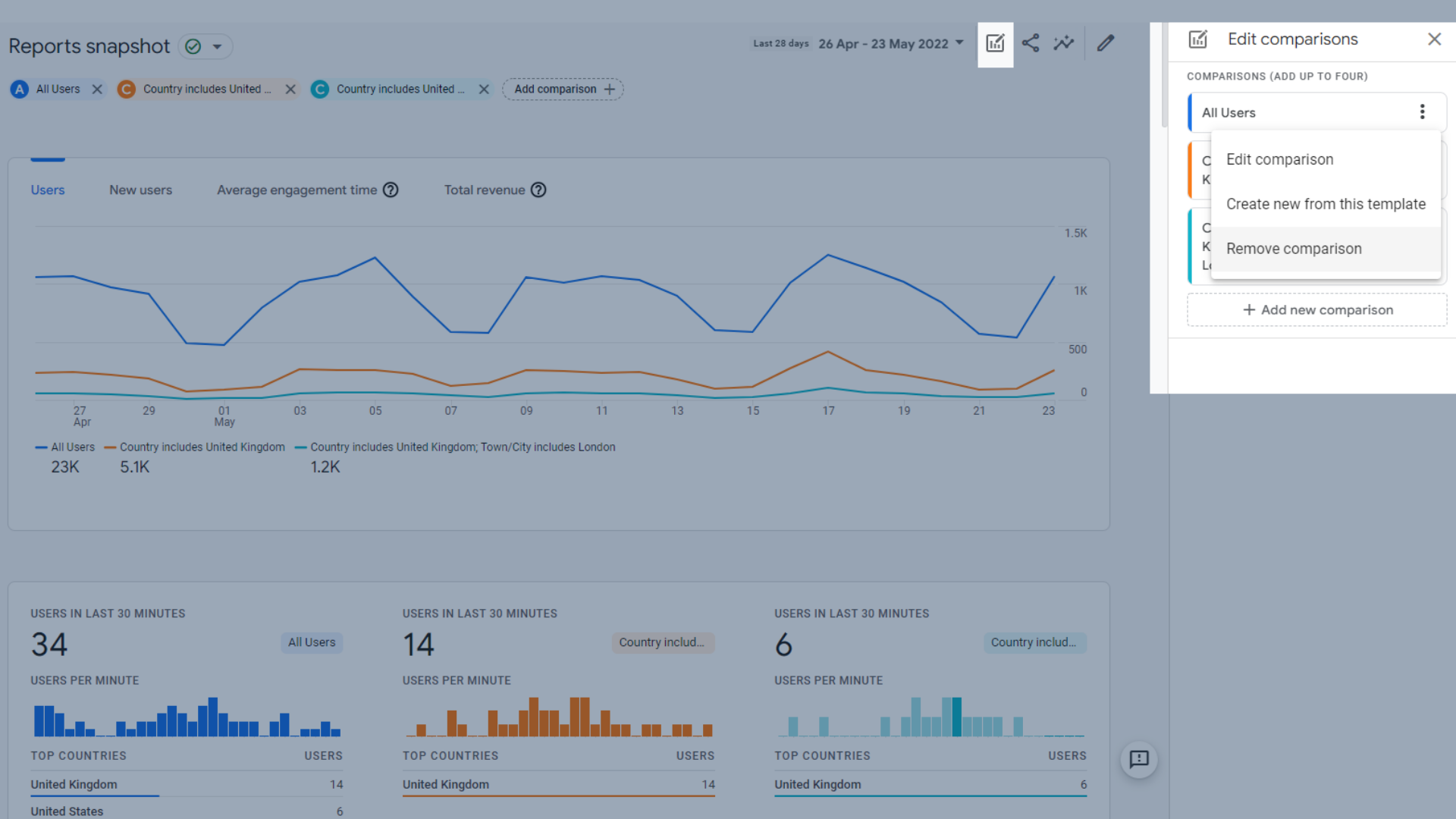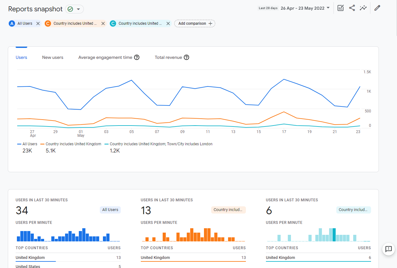 지금은 모든 사용자의 데이터를 보고 있으므로 세그먼트를 사용하여 미국과 영국을 비교하겠습니다.