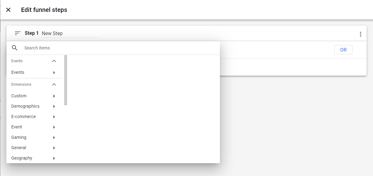 " 새 조건 추가 "를 클릭하면 드롭다운 메뉴가 나타납니다. 첫 번째 단계에서는 " view_item " 이벤트를 선택합니다. 이것은 사용자가 제품 페이지를 보는 것이 아니라 메뉴 또는 목록에서 보는 것과 같이 웹 사이트에서 모든 용량의 항목을 보는 경우입니다.