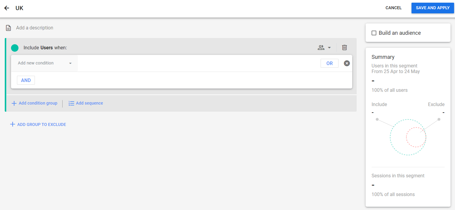 세그먼트를 생성할 때 데이터를 포함하거나 제외하도록 선택할 수 있습니다. 영국 사용자도 포함됩니다.