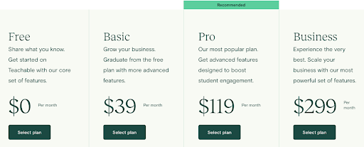 Teachable은 무료 , 기본 , 프로 및 비즈니스 의 4가지 요금제를 제공합니다.