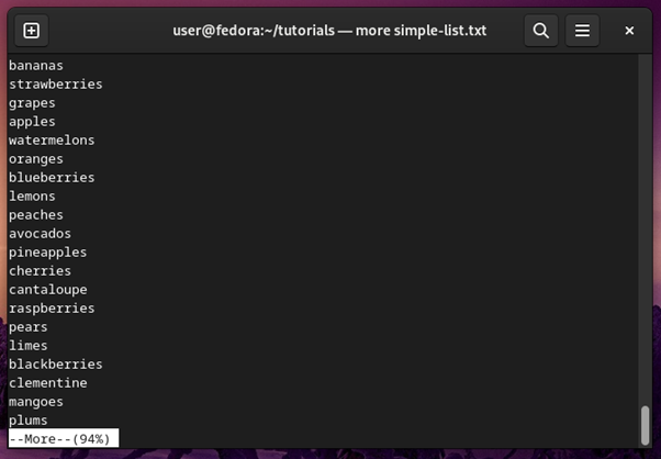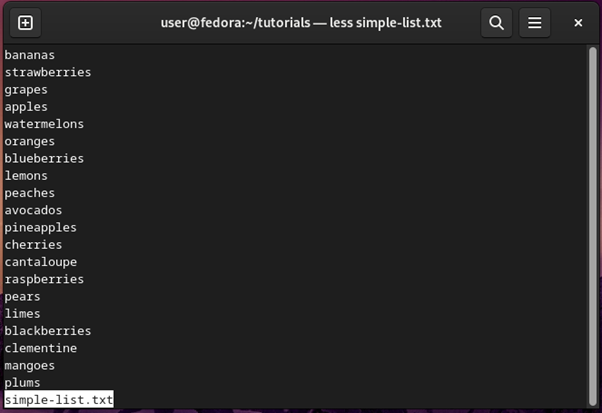 $ cat simple-list.txt bananas strawberries grapes apples watermelons oranges blueberries lemons peaches avocados pineapples cherries cantaloupe raspberries pears limes blackberries clementine mangoes plums