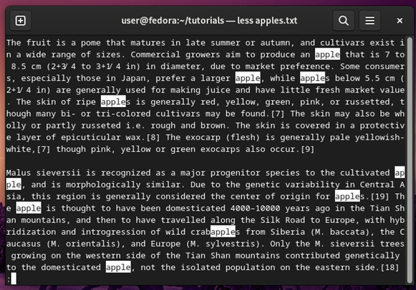 예를 들어, cultivar라는 단어가 처음 나타날 때 apples.txt 파일을 열려면 다음 명령이 사용됩니다.