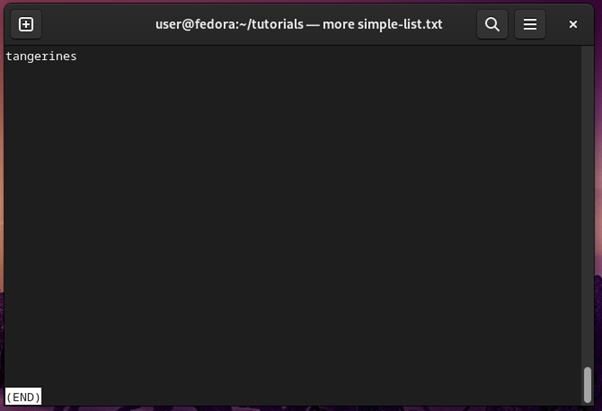 $ tail simple-list.txt cherries cantaloupe raspberries pears limes blackberries clementine mangoes plums tangerines