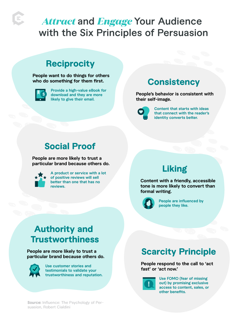 모든 콘텐츠 제작자는 청중을 성공적으로 유치하고 참여시키기 위해 설득 기술에 의존합니다. 첫째, 일반 브라우저는 링크를 클릭해야 읽을 수 있습니다. 그런 다음, 읽을 때 페이지는 계속 거기에 머물 수 있을 만큼 충분히 매력적이어야 합니다. 마지막으로 독자는 클릭 유도문안 버튼을 클릭하고 전환을 생성해야 합니다.