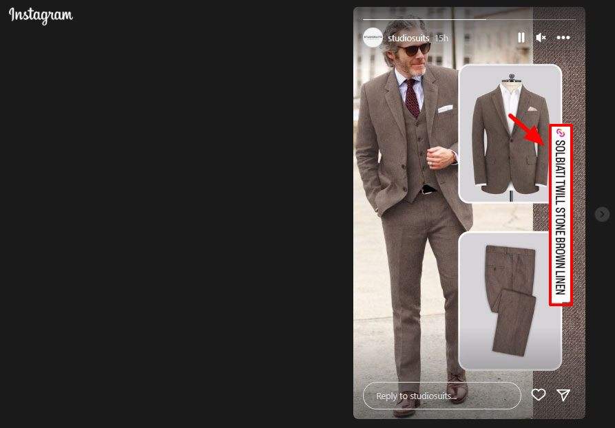 W powyższym przykładzie StudioSuits prezentuje jeden ze swoich najlepszych niestandardowych garniturów w swoich relacjach wraz z szybkim linkiem. Gdy widzowie klikną link, przejdą do opcji szybkiej płatności, usuwając niepotrzebne bariery wejścia: