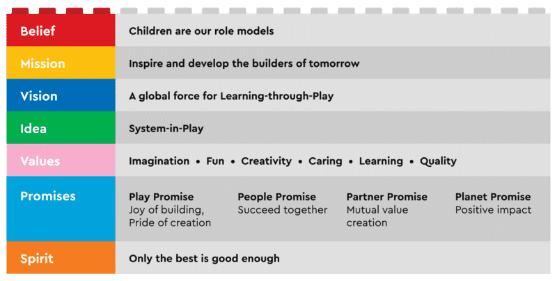 Historia LEGO sięga prawie wieku. Przez cały ten czas misją firmy było „inspirować i rozwijać budowniczych jutra”. Dzięki wczesnemu zdefiniowaniu tej misji, a następnie wpisaniu jej w DNA firmy, LEGO było w stanie stworzyć dobrze prosperującą markę. Widać to we wszystkim, co robi firma, od projektowania i tworzenia nowych zestawów po ich komunikację.