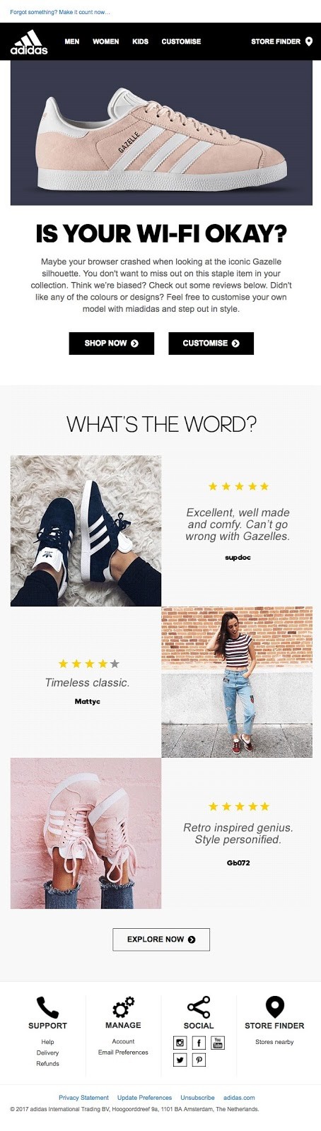 Jeśli również zauważyłeś, recenzje klientów zajmują większą część wiadomości e-mail. Jest to jeden ze sposobów na stworzenie FOMO (strachu przed pominięciem) z porzucającymi użytkownikami. Adidas dodaje kolejne wezwanie do działania zaraz po tym, z korzyścią dla klientów, którzy muszą przeczytać tak daleko, aby się przekonać.