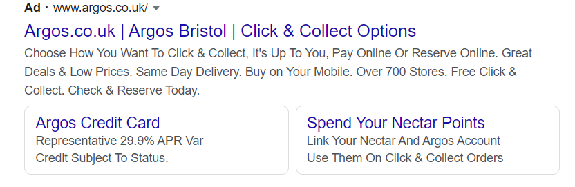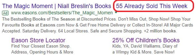Easons wykorzystuje rabaty w swoich reklamach, aby przyciągnąć potencjalnych klientów. Używa również wysoko ocenianego słowa „twój”, aby reklama wyglądała na osobistą. Wreszcie, Easons wykorzystuje swoje rozszerzenia, aby podkreślić swoją ocenę 4,4 z wieloma pozytywnymi opiniami. Pomoże to klientom zaufać marce, a tym samym zachęci do zakupów.