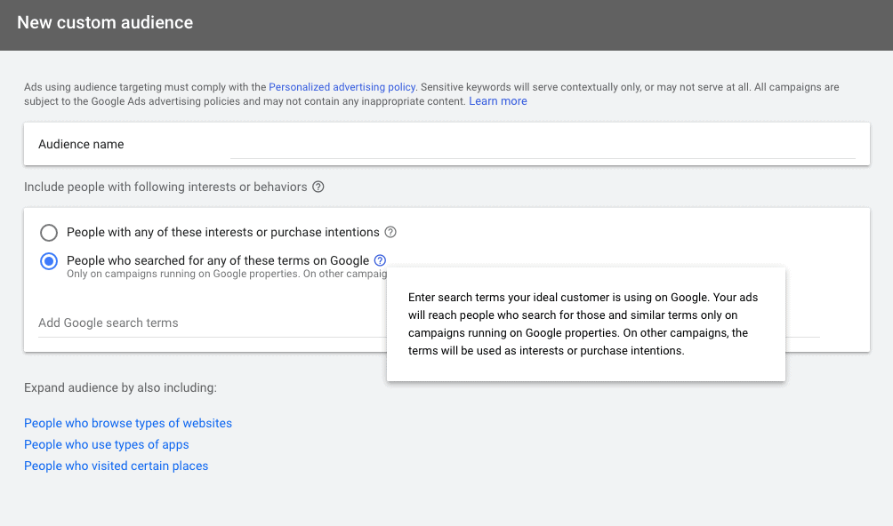 Krok 3: utwórz niestandardowych odbiorców w Google Ads