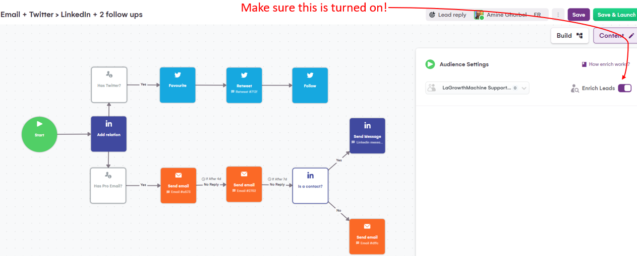 Jak widać na tym zrzucie ekranu, wzbogacanie jest włączone. LaGrowthMachine automatycznie znajdzie e-maile, numery telefonów, konta LinkedIn i tak dalej…