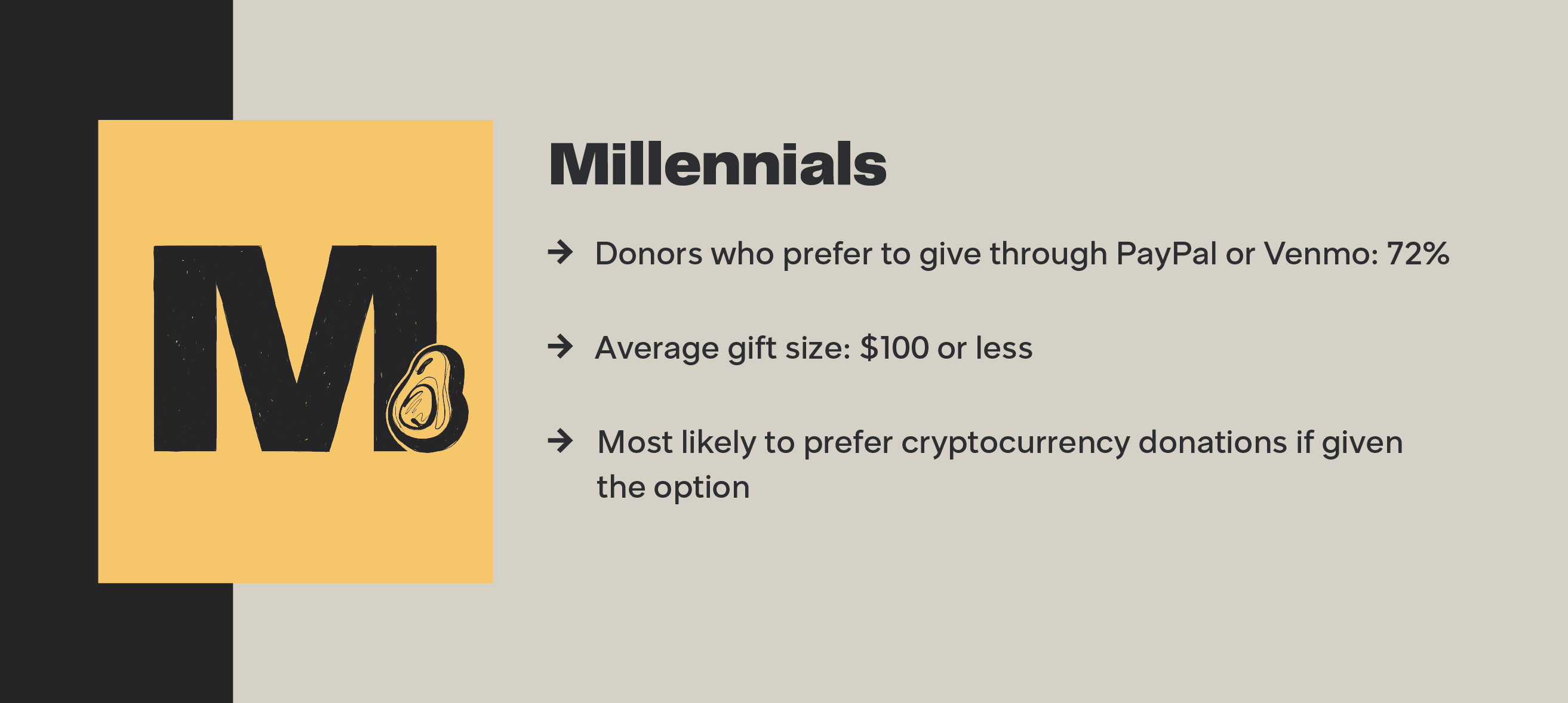 Rozważ to: 55% darczyńców jest zainteresowanych przekazaniem za pośrednictwem PayPal lub Venmo, jeśli organizacje non-profit przedstawią opcje, a 20% ponownie rozważyło przekazanie darowizny, gdy ich preferowana opcja płatności nie została uwzględniona przez organizację non-profit.