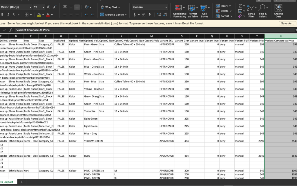 Funkcje importowania i eksportowania plików CSV w Shopify mogą być również używane w celu zapewnienia funkcji porównania w cenie. W rezultacie otrzymasz arkusz kalkulacyjny ze wszystkimi informacjami o swoich przedmiotach.
