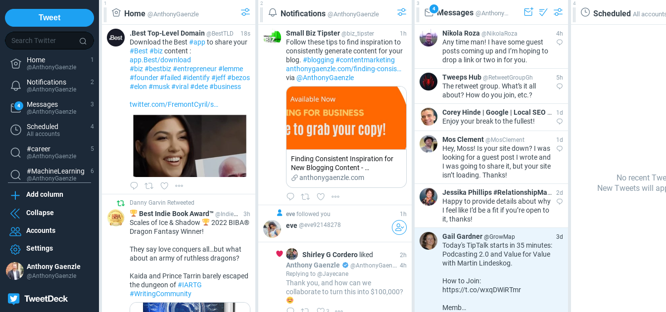 TweetDeck to darmowe narzędzie, za pomocą którego możesz zarządzać swoimi kontami na Twitterze. Jest łatwy w użyciu i ma wiele funkcji, takich jak możliwość tworzenia niestandardowych osi czasu, planowania tweetów i śledzenia hashtagów.