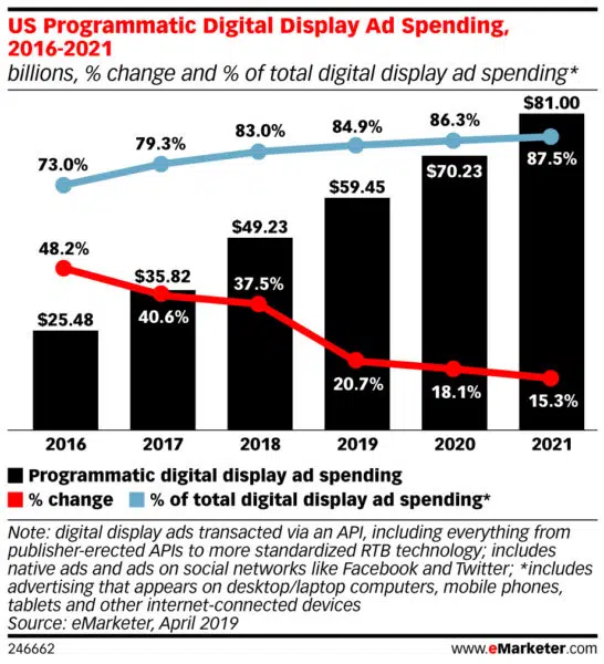 Według eMarketer, w Stanach Zjednoczonych wydatki na zautomatyzowane cyfrowe reklamy displayowe wyniosą 115,23 miliarda dolarów w 2022 roku, co stanowi 90,2% rynku cyfrowych reklam displayowych.