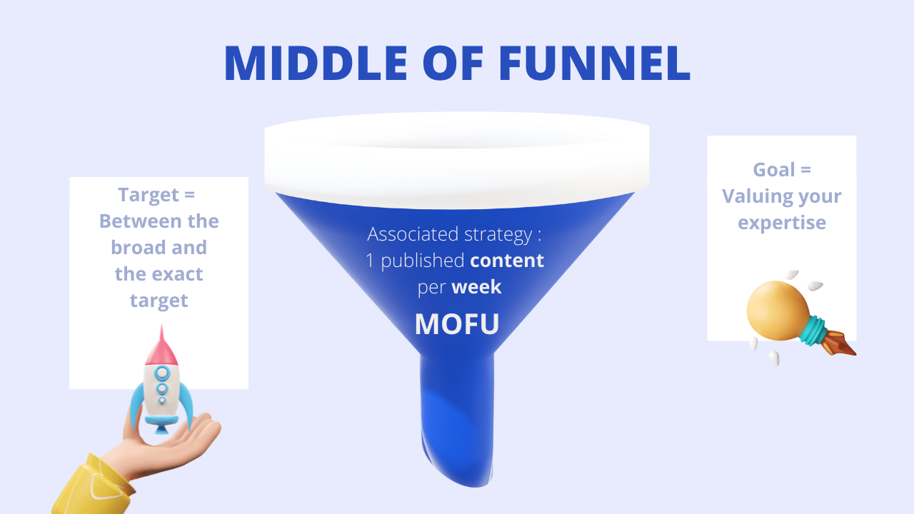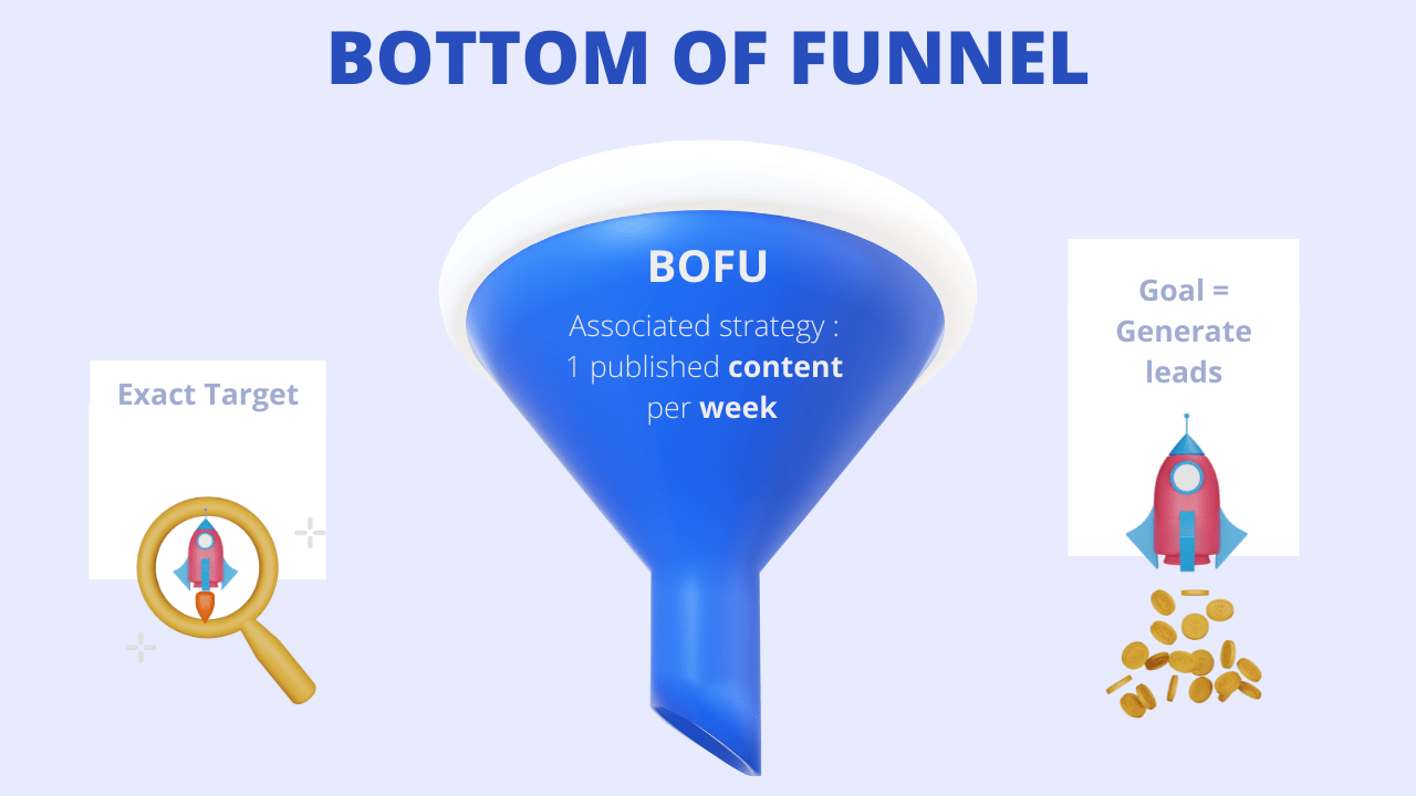 Tam będziesz jeszcze bardziej precyzyjny, „dno lejka”, to twoje serce celu i odpowiedź na jego problemy. Jest to faza „miękkiego poszukiwania / marketingu przychodzącego ”, w której przekształcasz potencjalnych klientów w klientów. Przykłady:
