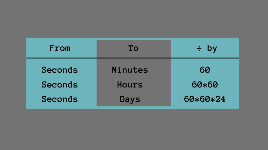 Portanto, para converter de segundos para minutos, horas e dias, você pode usar a tabela a seguir e dividir pelo fator de conversão correspondente.