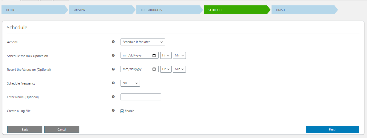 Você pode executar a edição em massa imediatamente ou agendá-la para mais tarde. Você pode definir a data e a hora desejadas para a execução se estiver planejando agendá-la para mais tarde. Além disso, você pode definir um horário para reverter as alterações. Você pode definir um período de tempo para executar a edição em massa, bem como definir uma frequência para a execução, como diária, semanal ou mensal. Aqui, você também pode criar um arquivo de log que armazena todas as informações sobre o trabalho. Clique em Concluir após o agendamento da execução.