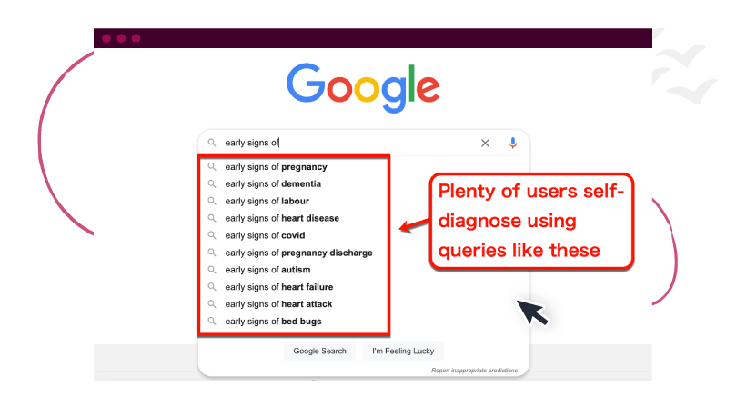 Em vez de visitar a clínica mais próxima, um número crescente de pacientes confia no autodiagnóstico por meio de pesquisas on-line. As consultas de pesquisa típicas incluem palavras-chave e frases como “sintomas”, “como saber se tenho” e “sinais precoces de”.
