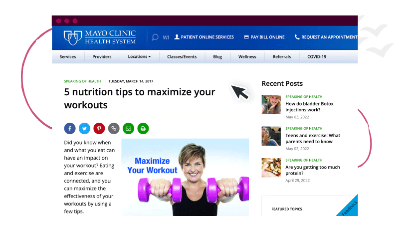 A Mayo Clinic é uma fonte de informações médicas para pessoas que pretendem autodiagnosticar todos os tipos de sintomas. O blog também solidificou com sucesso a autoridade da marca quando se trata de conselhos práticos de saúde. Confira o blog da Mayo Clinic para obter exemplos e inspiração de redação de conteúdo médico.