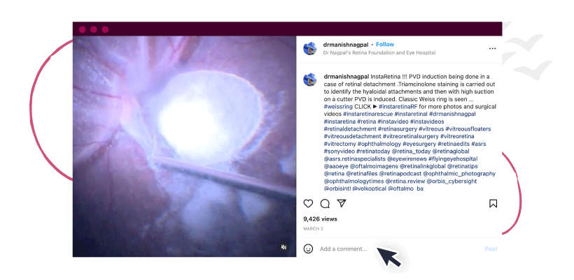 Imagens de procedimentos como a postagem do Dr. Nagpal no Instagram são um bom exemplo de conteúdo de vídeo de formato curto envolvente. Além do vídeo ampliado, a postagem inclui uma descrição detalhada do vídeo junto com uma lista de hashtags relevantes.