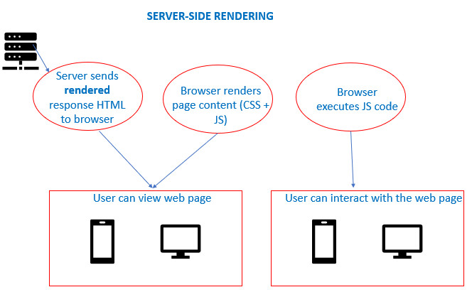 Por exemplo, na renderização do lado do servidor , o servidor contém o conteúdo do site. Mediante solicitação, o navegador recebe o HTML totalmente renderizado.