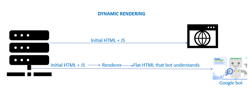 A terceira opção de renderização é a renderização dinâmica , onde o conteúdo renderizado no lado do cliente vai para o navegador, enquanto o conteúdo renderizado no lado do servidor vai para o(s) mecanismo(s) de pesquisa.
