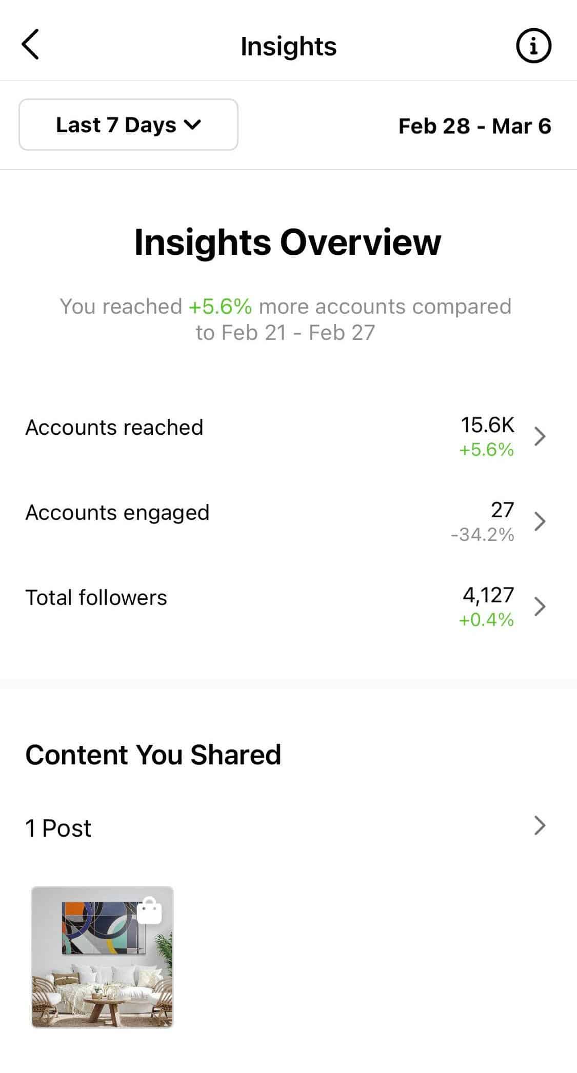 Os relatórios podem ser super úteis para moldar sua estratégia social. Alguns canais têm sua própria funcionalidade de relatório integrada que pode ajudar você a descobrir mais sobre seu público e seu desempenho de postagem. Isso pode ser útil, no entanto, os dados geralmente são limitados, como podemos ver no exemplo do Instagram Insights abaixo.