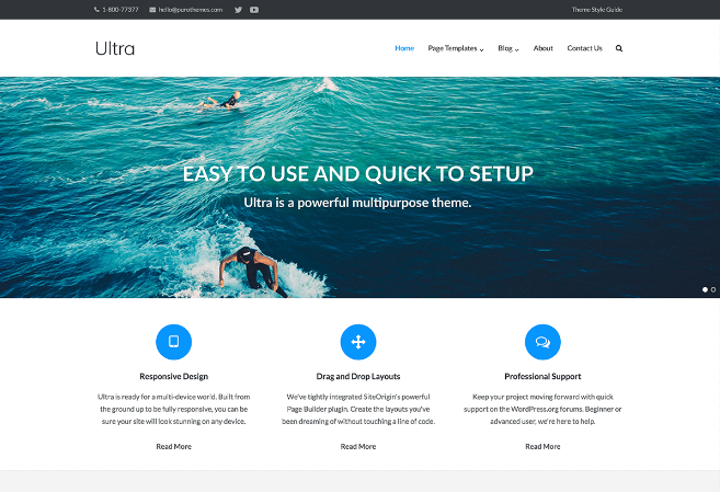Ultra é um tema corporativo ultramoderno para ser usado em sites de negócios WordPress. Há um suporte interno de arrastar e soltar que permite que os usuários criem facilmente e instantaneamente quaisquer páginas de negócios que desejarem.