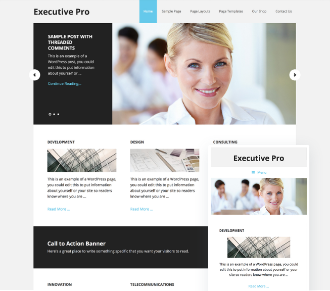 O principal recurso do tema Executive Pro WordPress é uma página inicial de widget para personalização. A página inicial apresenta um grande controle deslizante para configurar o perfil da empresa, projetos, visão e missão. Existem vários esquemas de cores, vários layouts de página e opções como personalizador de tema e banner de chamada para ação com um clique. Há também uma opção para configurar um widget de newsletter personalizado por e-mail.