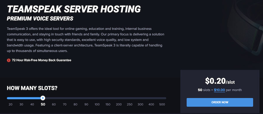 Encomende seu servidor de voz hoje por apenas US$ 6/mês por 20 slots. Você pode escolher complementos como porta de desejo e Teamspeak Music Bot. OBHost vem com uma opção de reembolso de 14 dias para que você possa testar seus serviços em 14 dias e decidir se deseja comprá-lo ou não.
