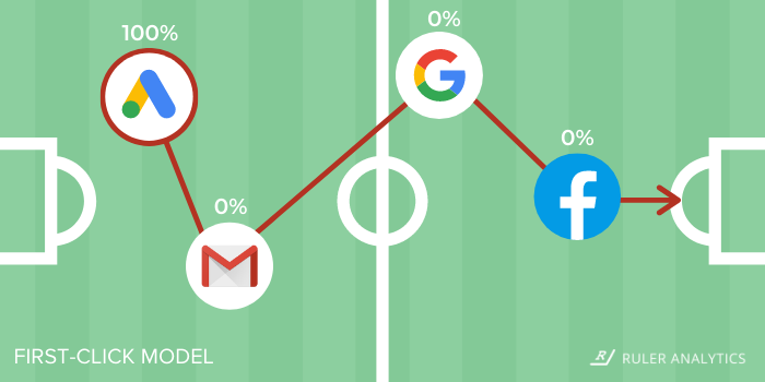 - Prima interacțiune de marketing: prima interacțiune pe care un utilizator o are cu afacerea dvs., cum ar fi un clic pe unul dintre anunțurile sau postările dvs. pe rețelele sociale.