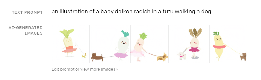 Aici, puteți vedea că textul introdus a fost „o ilustrare a unui pui de ridiche daikon într-o fustă de balet care plimbă un câine”, iar rezultatele au dat exact asta. Vă puteți gândi la orice și puteți scrie în el pentru a obține ideea exactă generată în arta digitală. În afară de asta, puteți solicita și fotografii de stoc, schițe etc. Cerul este limita.
