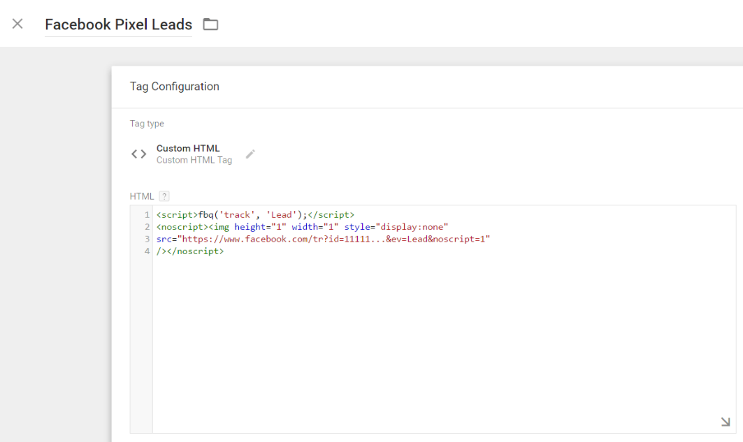 Etichetele înregistrează codul pe care doriți să-l rulați și sunt legate de un Trigger care îi spune când să ruleze. De exemplu, codul dvs. Facebook Lead Standard Event: