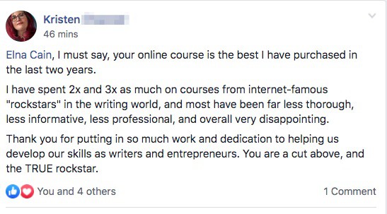 Ceea ce este grozav la cursul meu de scris este că are un grup privat de Facebook la care te poți alătura. Menționez acest lucru în modulul de introducere.