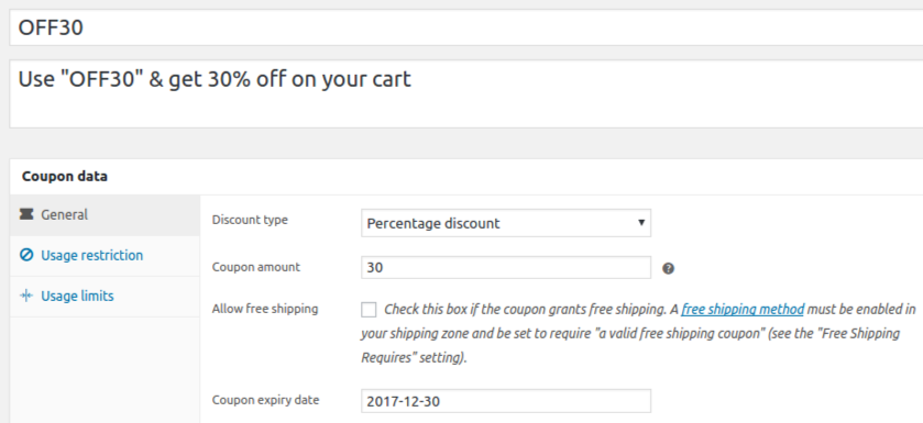 Reducerea procentuală este pentru acordarea unei reduceri procentuale la anumite produse/categorii/subtotal coș. De exemplu, cuponul dvs. poate fi „Folosiți OFF30 pentru o reducere de 30% la achiziția dvs.”. Pentru acest cupon, selectați opțiunea Reducere procentuală ca tip de cupon, sumă pe care doriți să o oferiți (30%) și data de expirare. Livrarea gratuită este opțională.