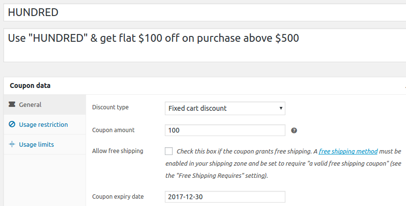 Pentru a aplica un cupon pentru subtotalul coșului clientului, trebuie doar să urmați capturile de ecran de mai jos. De exemplu, lăsați-vă reducerea să fie „Folosiți SUTE, obțineți o reducere fixă de 100 USD la achiziționarea de peste 500 USD”. Pentru acest cupon, selectați tipul de reducere WooCommerce ca Reducere fixă la coș , Suma cuponului ca 100 în fila General și Cheltuială minimă în fila Restricție de utilizare ca 500 .