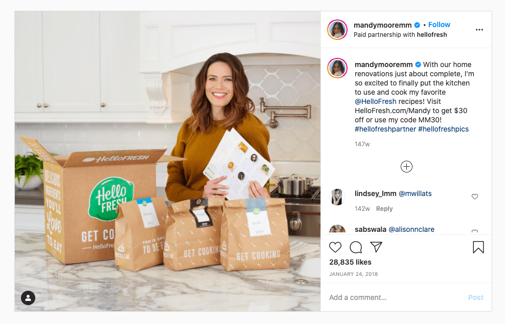 Lucrul cu influenți este o abordare care a funcționat bine pentru serviciile de truse de livrare de masă precum HelloFresh. (Această postare de la Mandy Moore a generat aproape 30.000 de aprecieri.)