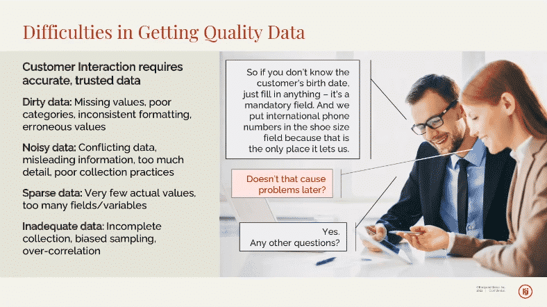 „Una dintre provocările pe care le vedem cu clienții noștri este obținerea de date de calitate”, a spus Kris Tomes de la Redpoint în același webinar. „Lupta devine „Datele mele sunt murdare? Există consecvență în modul în care este formatat și cum este stocat?'”