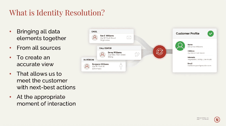 „Este vorba de identificarea elementelor pe care le-am folosi pentru a crea identitatea [clientului]”, a spus el. „Este vorba de pomparea tuturor acestor date într-un proces de rezoluție a identității care utilizează acele câmpuri [de date] pentru a compara înregistrările.”