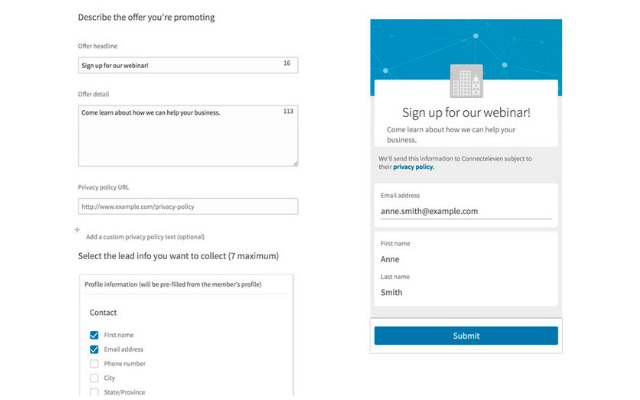 Similar cu reclamele Facebook de generare de clienți potențiali, LinkedIn oferă, de asemenea, formulare de generare de clienți potențiali pentru a face publicitatea mai ușoară.