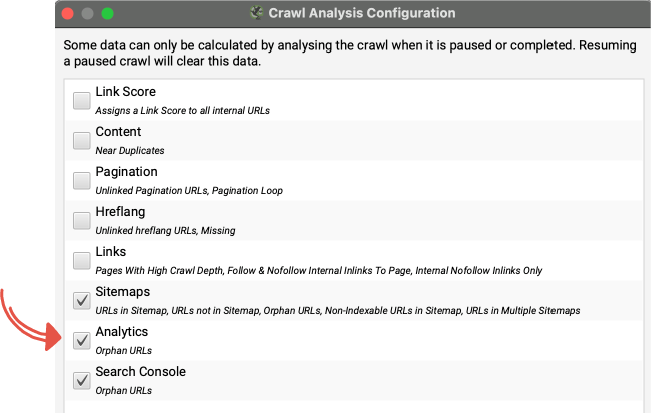 Deoarece acum sunt interesat doar de adresele URL orfane, am debifat anumite opțiuni. Cu toate acestea, puteți bifa fiecare casetă dacă doriți mai multe date. Asigurați-vă că sunt bifate casetele pentru Sitemaps, Analytics și Search Console. Dacă nu ați conectat unul dintre acestea, lăsați acea casetă nebifată. Faceți clic pe „OK”.