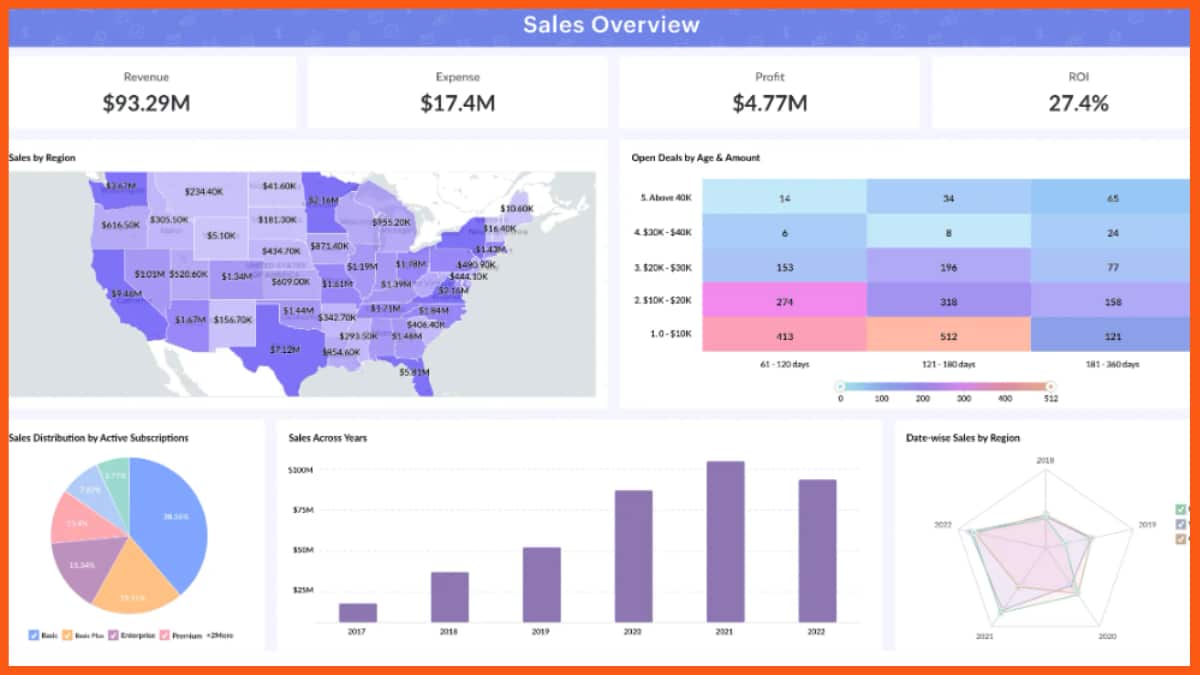 - Analiză vizuală : Zoho Analytics oferă o multitudine de instrumente de vizualizare, inclusiv diagrame, pivot, widget-uri, rezumate și vederi tabelare, pentru a crea rapoarte și a obține informații.