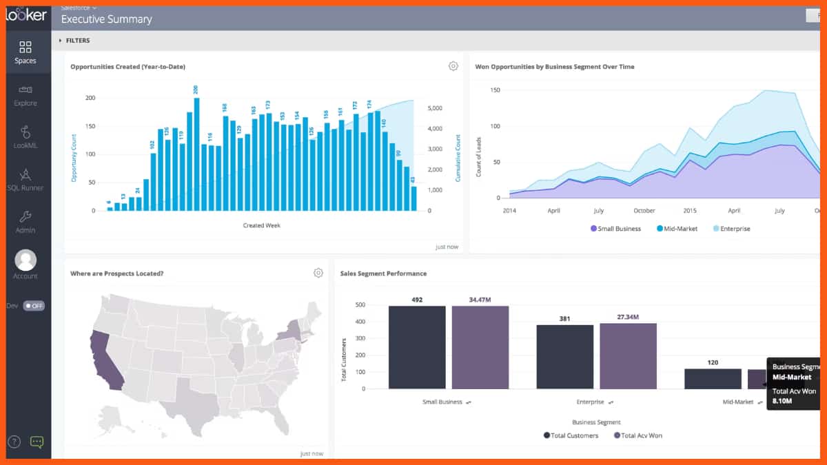 Looker este o platformă puternică de business intelligence care ajută echipele de afaceri să dezvolte și să partajeze vizualizări perspicace pentru a lua decizii de afaceri informate. Instrumentul BI face parte din Google Cloud Platform. Oferă un flux de lucru ușor de utilizat, imagini personalizate, tablouri de bord colaborative și asistență eficientă pentru clienți. Looker este complet bazat pe browser, eliminând nevoia de a instala software pentru desktop.